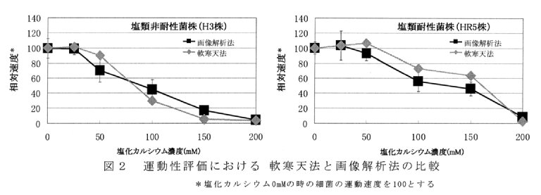 - 高濃度塩化カルシウムによる菌体の運動性抑制は、軟寒天法と同様に画像解析法にて解析可能である(図2)。