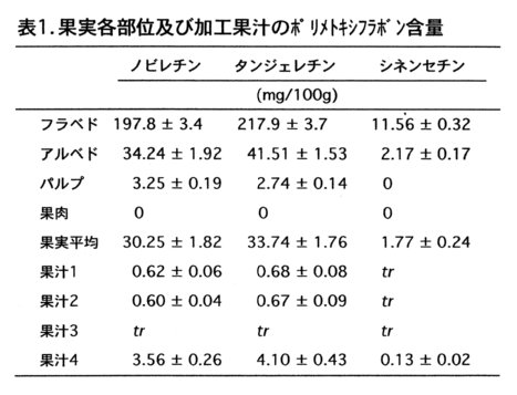 - ポンカン果実の含有するポリメトキシフラボン類は、果皮表面のフラベド部位及びその内側のアルベド部位に局在する(表1)。