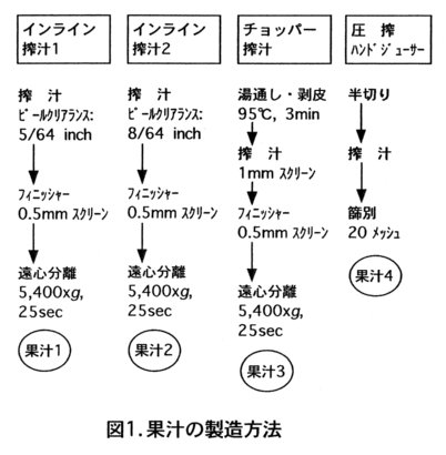 - 業界における搾汁法の普及状況並びに生産コストを考慮すると、上記機能性成分を豊富に含有する果汁の製造法としては、インライン搾汁法(5/64)が適当と考えられる。