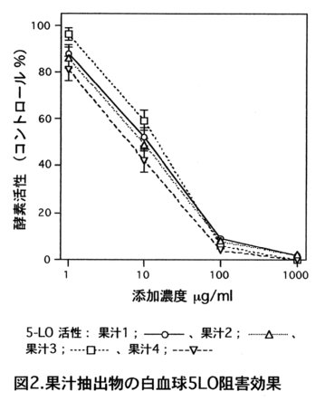 - ラット白血球5-リポキシゲナーゼ(5-LO)阻害成分は、圧搾果汁の阻害活性が若干高いもののチョッパー搾汁と差が小さいことから果汁に由来すると推察される(図2)。