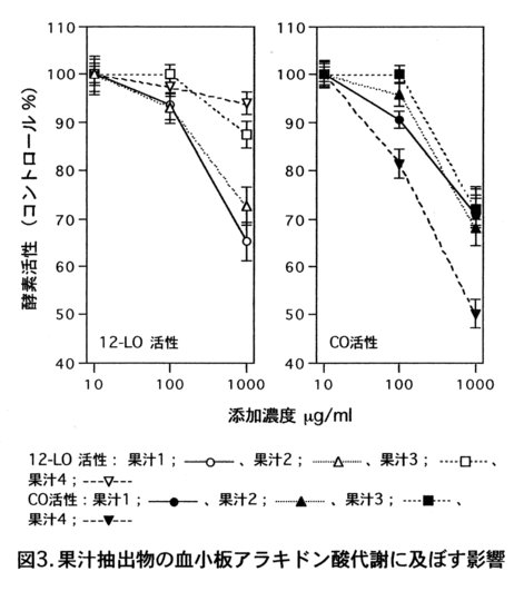 - ラット血小板12-リポキシゲナーゼ(12-LO)阻害成分の抽出は、インライン搾汁法(5/64、8/64)が適し、血小板シクロオキシゲナーゼ(CO)阻害成分については圧搾法が適すると判断される(図3)。