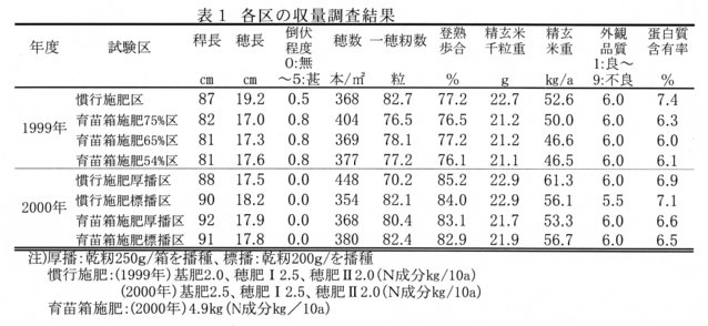 - 「コシヒカリ」の乳苗疎植栽培において育苗箱全量施肥を行った場合、慣行施肥法に比べて25~30%の減肥で約95%の収量が確保でき、白米蛋白質含有率が低くなるので、省力的な良食味栽培法として実用可能である。