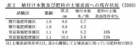 - 播種量を厚播(乾籾250g/箱)とすると、標播(乾籾200g/箱)の場合に比べて根の肥料保持力が向上し表面に残る肥料の割合は減少するが、やや太植えとなり播種量による収量の差はほとんどない(表2)。