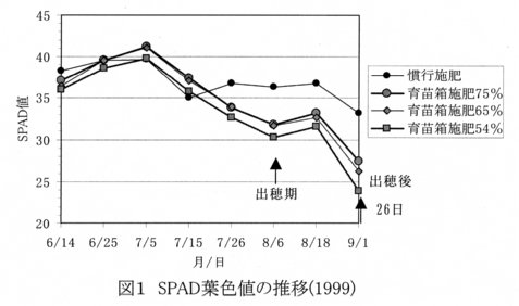 - 育苗箱全量施肥栽培では、登熟期間中のSPAD葉色値が慣行施肥よりも低く推移するので(図1)、精玄米千粒重はやや小さいものの、白米蛋白質含有率は低い(表1)。