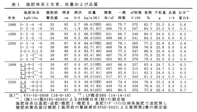 - 側条施肥における速効性肥料の基肥量は、10a当たり窒素成分2~3kgでは4㎏に比べ収量が低下する。また、速効性肥料では穂肥前の栄養凋落がみられ全層施肥に比べ低収である(表1)。