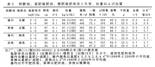 - 穂肥は、分施すると一回施用に比べ増収する。また、白米蛋白含有率は分施しても1回施用とほとんど差が無い。しかし、側条施肥では地力がやや高い場合では、分施による増収効果はみられない(表2)。
