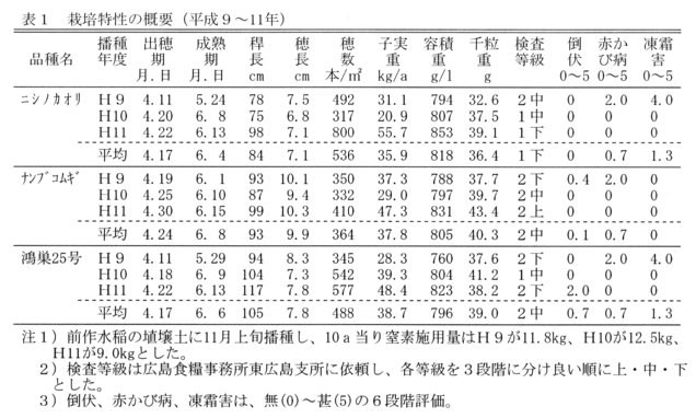 - パン用小麦「ニシノカオリ」を広島県で栽培すると、「ナンブコムギ」、「鴻巣25号」に比べ早熟、短稈で倒伏に強く、製パン適性に優れる。