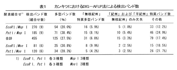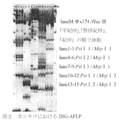 - RAPD法より再現性が高く、シークエンサーやRIを必要とせず、より簡便なnon-RIシステムを利用したDIGーAFLP法の開発を行い、カンキツ「無核紀州ミカン」雌性不稔品種特異バンドの検出に利用する。