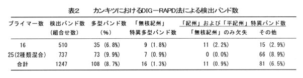 - DIG-RAPD法と比較して、より多くの多型バンドの検出が可能であり、「無核紀州ミカン」品種特異的に検出される多型バンドの割合も高い。(表1、表2)