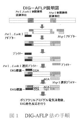 そこで、Vossら(1995)の方法を改良し、より簡便でシークエンサーやRIを必要としない方法として、DIG-RAPD法より再現性の高いDIG-AFLP法の開発を行い、雌性不稔に関するDNAマーカーを作成するための「無核紀州ミカン」特異バンドの検出に利用する。