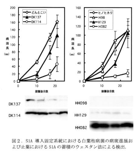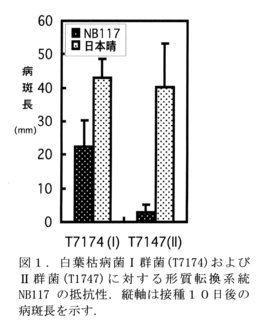 - イネ品種「日本晴」・「どんとこい」・「ヒノヒカリ」を材料として、導入遺伝子について遺伝的に固定した形質転換系統を育成し、出穂期の止葉に対する剪葉接種法によって白葉枯病菌に対する抵抗性検定を行った。いくつかの系統はI群菌およびII群菌に対して原品種と比べてより強い抵抗性を示した(表1・図1).