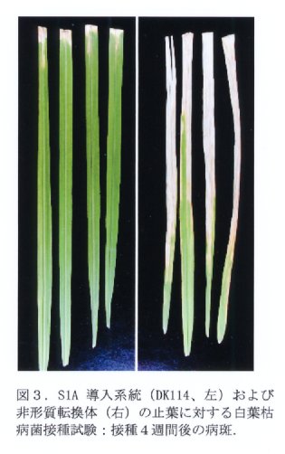 - イネ品種日本晴、どんとこい、ヒノヒカリにザルコトキシンIA遺伝子を導入し、固定した系統を得た。導入遺伝子産物を安定に発現する系統には白葉枯病菌に対する抵抗性が付与されている。