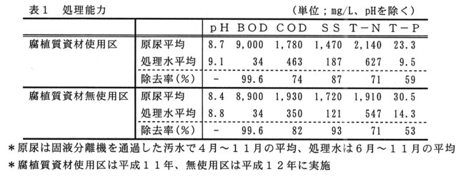 - 両区ともBOD除去率は99%以上と極めて高く、SSも除去率はやや低いものの、前処理での除去とあわせると高い除去率となり、汚物感がなくなる(表1)。