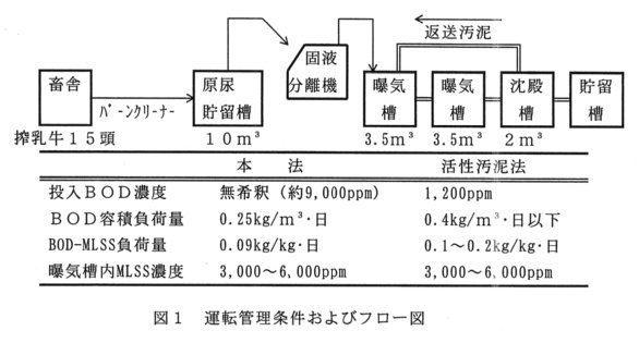- 運転条件は搾乳牛15頭規模でBOD容積負荷量0.25kg/m3 ・日、BOD-MLSS負荷量0.09kg/kg・日とし、無希釈の汚水を投入することである(図1)。