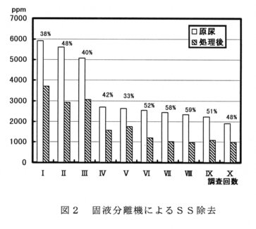 - 固液分離機によるSS除去率は平均47%で除去効果が高い。(図2)。