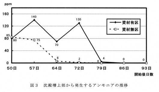 - 沈澱槽内上部から発生するアンモニアは両区とも運転開始後80日前後で未検出となり、無臭となる(図3)。