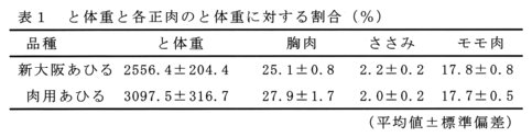 - 新大阪あひるのと体重は大阪あひるの 1.4倍程度に増加したが、現在主に肥育されている肉用あひるに対しては約83%である(表1)。