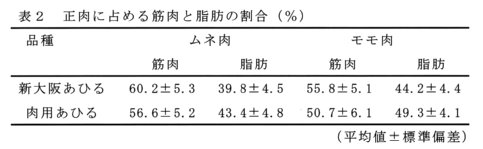 - と体重に対する正肉の割合は、ムネ肉で25.1%、モモ肉で17.8%である。肉用あひるとの比較では、ムネ肉の割合は約3%低く、モモ肉の割合はほぼ同じである(表1)。