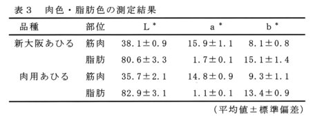 - 新大阪あひるの肉色はa* 値が高く肉用あひるよりも赤味が強い。脂肪色は、薄い皮下脂肪の下の肉色の影響を受けて、a* 値・b* 値とも新大阪あひるが高い(表3)。