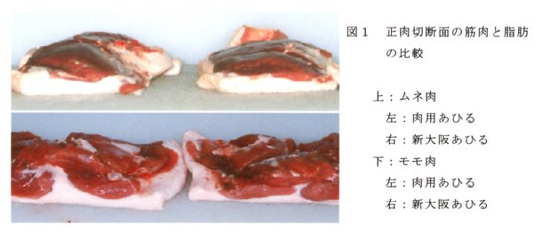 - 新大阪あひるは肉用あひるに比較して、正肉に占める筋肉(赤身)の割合が約5%高く、また脂肪の割合はは約5%低く、低脂肪品種の特性が維持されている(表2、図1)。
