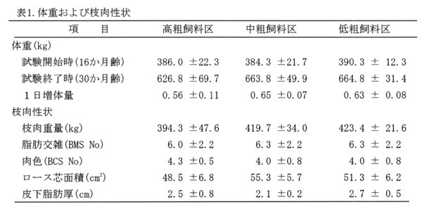 - 増体量と枝肉重量は高粗飼料区が他に比べ低い傾向を示した。ロース芯面積は中粗飼料区が大きい傾向を示した(表1)。