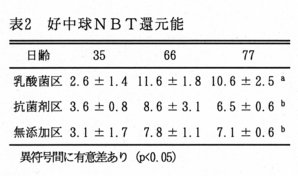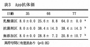 - 細胞性免疫の指標である好中球NBT還元能、液性免疫の指標であるアクチノバシラス症(App)抗体価は、77日齢では乳酸菌区が無添加区、抗菌剤区に比べていずれも有意に上昇する(表2、表3)。