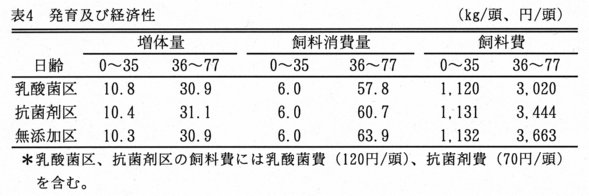 - 各区の増体量に有意差はなく、乳酸菌区では36~77日齢の飼料消費量が少ない(表4)。