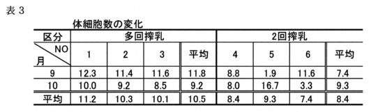 - 生乳中の体細胞数を各個体別に3回調査したところ、2回搾乳では平均8.4万、多回搾乳は平均10.5万となったが、有意差は認められなかった。