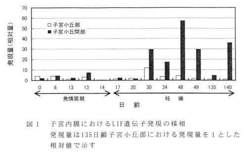 - 発情周期および妊娠初期から中期のウシ子宮内膜では、白血病阻止因子(leukemia inhibitory factor (LIF))ならびにマクロファージコロニー刺激因子(macrophage colony stimulating factor (M-CSF))遺伝子が発現している。LIF遺伝子は胎盤形成期から妊娠中期の子宮小丘間部で、M-CSF遺伝子は妊娠中期の子宮小丘間部で高い発現を示す。