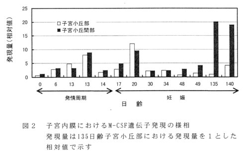 - M-CSF遺伝子発現は、妊娠135、140日の子宮小丘間部内膜で高く(図2)、妊娠中期に おけるM-CSFの関与とM-CSFと子宮腺との関係が推察される。