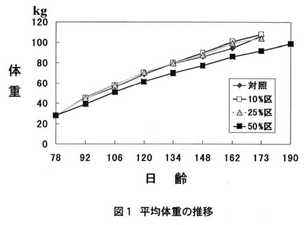 - 10および25%代替区では飼養成績、枝肉成績とも対照区と全く差を示さない。
