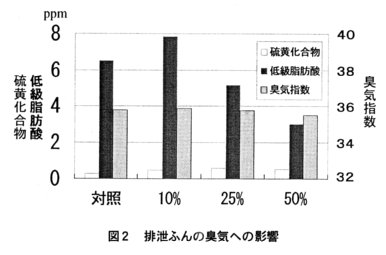 - 排泄ふん臭気は、代替率が高いほど硫黄化合物が増加するが、低級脂肪酸は逆に減少し臭気指数も低下するため、乾燥残さ給与により臭気が強くなることはない(図2)。
