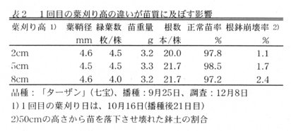 - 播種後20日、葉長が15cmになった頃に葉先を刈る処理を行うと、葉が硬くなり、倒伏しにくくなるとともに、病害発生や移植時の絡み合いを防ぐことができる。刈り高を5cm±3cmとすると苗質の劣化はみられない(表2)。その後、1週間間隔で草丈15cmとなるように刈る。定植時の苗の葉長を18cmとすると、充分な球の肥大が得られる。