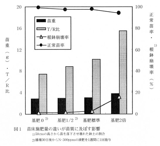 - 苗床の基肥は、N-P2 O5 -K2 Oの各成分1.5-1.5-1.0kg/aを標準とする。基肥のN成分が多くなると苗重は重くなるが、T/R比が大きくなり地上部の生育に比べて根部の生育が劣る。過繁茂になり正常苗率は低下し、根鉢の強度も弱くなる(図1)。とくに、気温の高い早生種の播種時期では、基肥を1/2に減らし、播種後30日目より、窒素濃度300ppmの液肥を1週間に1回施与し、生育を確保する方法が適する。