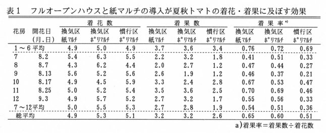 全展開換気法と再生紙マルチによる夏秋トマトの高温障害回避