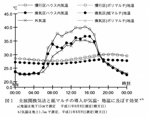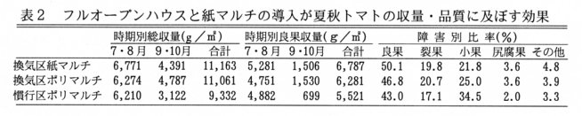 - そこで、換気法を改善してハウス内気温を外気温に近づけるとともに、地温上昇抑制効果がある再生紙マルチとの併用によって、夏秋トマトの後半の栽培安定と夏期の労働条件の改善を図る。
