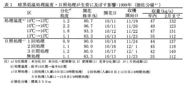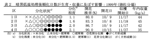 - 暗黒低温処理後、日陰で順化することで開花株率が向上する。順化日数が4日を超えると開花時期が遅くなり、年内収量が低下するので、適正日数は2~3日である(表2)。