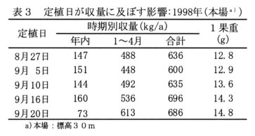 - 中山間地域の促成栽培では、暗黒低温処理による8月15日~8月25日定植が適作期である。平坦部では、暗黒低温処理促成栽培(9月5日頃定植)と普通促成栽培(9月20日頃定植)の作型組み合わせにより11月から安定した収量の確保が可能になる(表3、図1)。