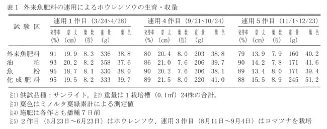- ホウレンソウ、コマツナの5連作(各作の施肥成分量: 25-10-10-10-10kgN/10a)でも、魚粉や油粕と同等の収量が得られ、連用が可能である。但し、収穫日数が60日程度を必要とする低温期の栽培では、化成肥料に比べると生育が劣る(表1)。