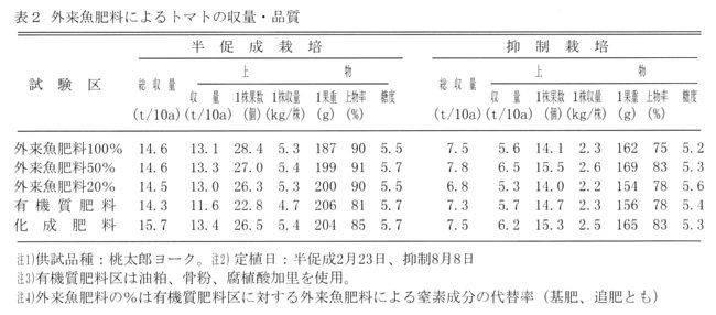 - トマトの半促成栽培(施肥成分量30kgN/10a、基肥割合40%)および抑制栽培(施肥成分量15kgN/10a、基肥割合30%)でも、油粕や骨粉に替えて外来魚肥料を基肥、追肥に使用して同等の収量性が得られる(表2)。尻ぐされ果、条ぐされ果等の発生が多くなることはない(データ略)。