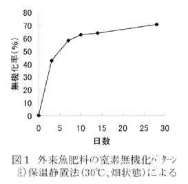 - 捕獲外来魚(ブルーギル)の加熱乾燥粉砕処理物(N:P2 O5 :K2 O=11.0:7.1:1.5%、以下外来魚肥料と略す)は、C/N比が4.1で、30℃の土壌中での無機化率(土壌中無機態窒素増加量/外来魚肥料中全窒素量×100)は3日で40%、10日で60%と速く、10日目以降の無機化増加率は少ない(図1)。