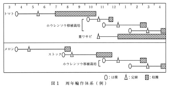 - 補完品目としては秋切りのストック及びキンギョソウ、さらに冬どりホウレンソウ及びコマツナが移植栽培法により2作導入可能である(図1)。キンギョソウは低温期の切花品質が劣り、コマツナはホウレンソウよりも収益性が低い。