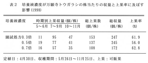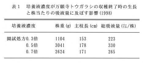 - 栽培期間中は園試処方0.5倍液を施用すると株の生長を促進できる(表1)。