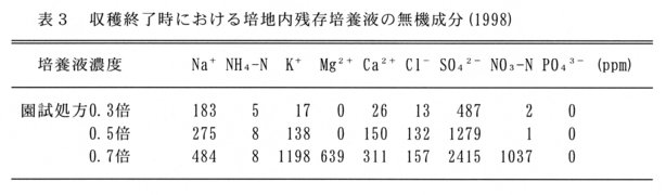 - 園試処方0.5倍液を施用することにより、栽培終了時において培地内にNa+ 、K+ 、Ca2+ 、Cl- 、SO4 2- が多く残存するが、NH4 -N、NO3 -N、Mg2+ 、PO4 3- は少ない(表3)。