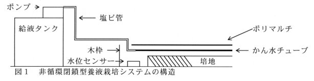 - ハウス栽培における連作障害、土壌伝染性病害を回避するためには養液栽培が効果的であるが、高度な給液管理技術を必要とすることから導入事例は少ない。そこで、給液管理の省力化と環境負荷軽減を目的として、緩衝能の高い有機質培地を用いた非循環閉鎖型養液栽培システムを開発し、これに適した培養液濃度を明らかにする。