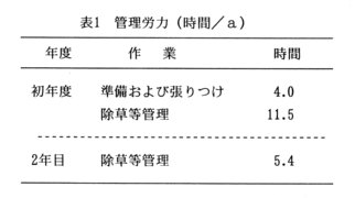 - 法面1a当たりの作業時間は、準備と張りつけが4時間、手取り除草が11.5時間の合計15.5時間である。全面被覆後の除草はほとんど不要で、2年目は刈り払い機による地上部除草のみの5.4時間で、除草労力が軽減できる(表1)。