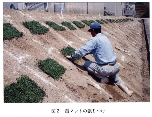 発表論文等:イワダレソウ苗マット張り付けによるのり面省力緑化技術、農及園76(3)、53-58、2001.