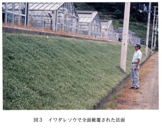 - 既存法面のススキ、チガヤ、セイタカアワダチソウ等の雑草を除草剤で枯らした後、5月に苗マットを1枚/m2 の割合で張りつけると、3か月後には全面を被覆する(図2、図3、図5)。花は5月から10月上旬まで咲き続け、観賞価値が高い。