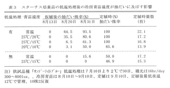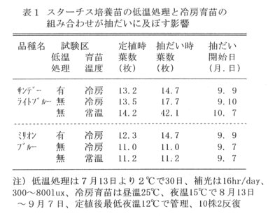 - 発根順化後の培養苗に育苗開始時から冷房育苗(昼温25℃/夜温15℃、25日間)あるいは、低温処理(2℃、300~800 lux 照明、30日間)後冷房育苗を行うことにより、「サンデーライトブルー」では、低温無処理、常温育苗に比べ抽だいが1ヶ月程度早まる(表1)。