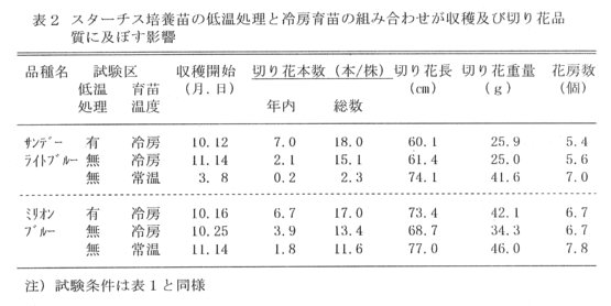 - 低温処理と冷房育苗の併用により、冷房育苗のみに比べて採花開始が、「サンデーライトブルー」では30日、「ミリオンブルー」では10日程度早くなり、両品種とも年内採花本数及び総採花本数が株当り3~5本程度多くなる(表2)。